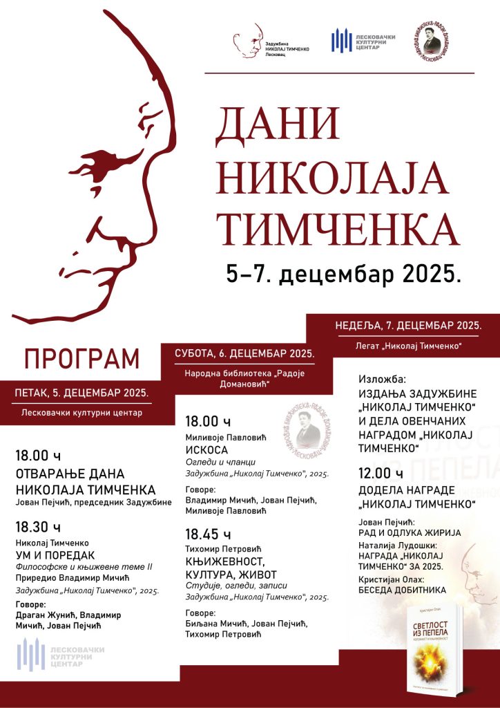 Manifestacija „DANI NIKOLAJA TIMČENKA“ koju u čast znamenitog istoričara književnosti, književnog kritičara, filozofskog pisca i esejiste organizuje Zadužbina „Nikolaj Timčenko” ove godine biće održana osamnaesti put. Programski sadržaji biće realizovani u tri dana, od 5. do 7. decembra, na tri lokacije u Leskovcu.