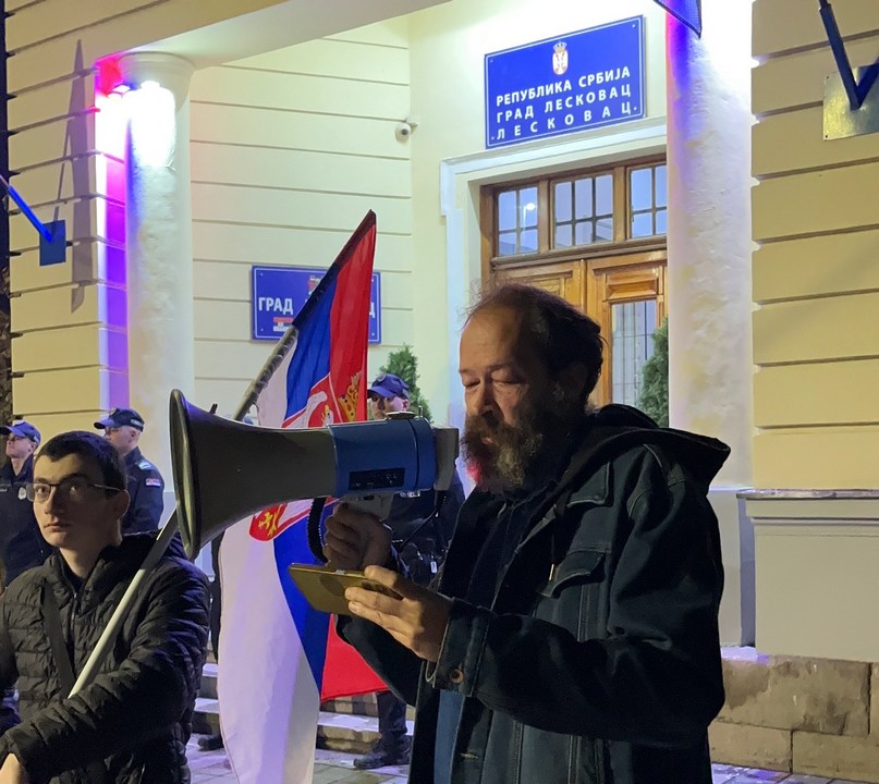 Da bi Leskovac bio slobodan grad, poručujemo ovogodišnjem laureatu, kada si već proglašen za džentlmena, kada imaš najlepšu baštu u gradu, a tvoja štiglica je šampion ptičije pesme, i verovatno ćeš se okititi još jednim gradskim priznanjem, ohrabri svoje stranačke kolege da zajedno sa tobom izađu na vanredne parlamentarne izbore, umesto što blokirate grad u borbi protiv naših blokada. Postoji kod vas u stranci jedan član koji je nadležan da te izbore raspiše pa probaj i njega da ohrabriš, jer nije dovoljno hrabar, jer kad ima tebe nema čega da se boji. Raspišite izbore, poručili su večeras građani i studenti na protestu ispred stadiona „Dubočica“ u Leskovcu, na kome će se sutra odigrati utakmica između Srbije i Albanije.
