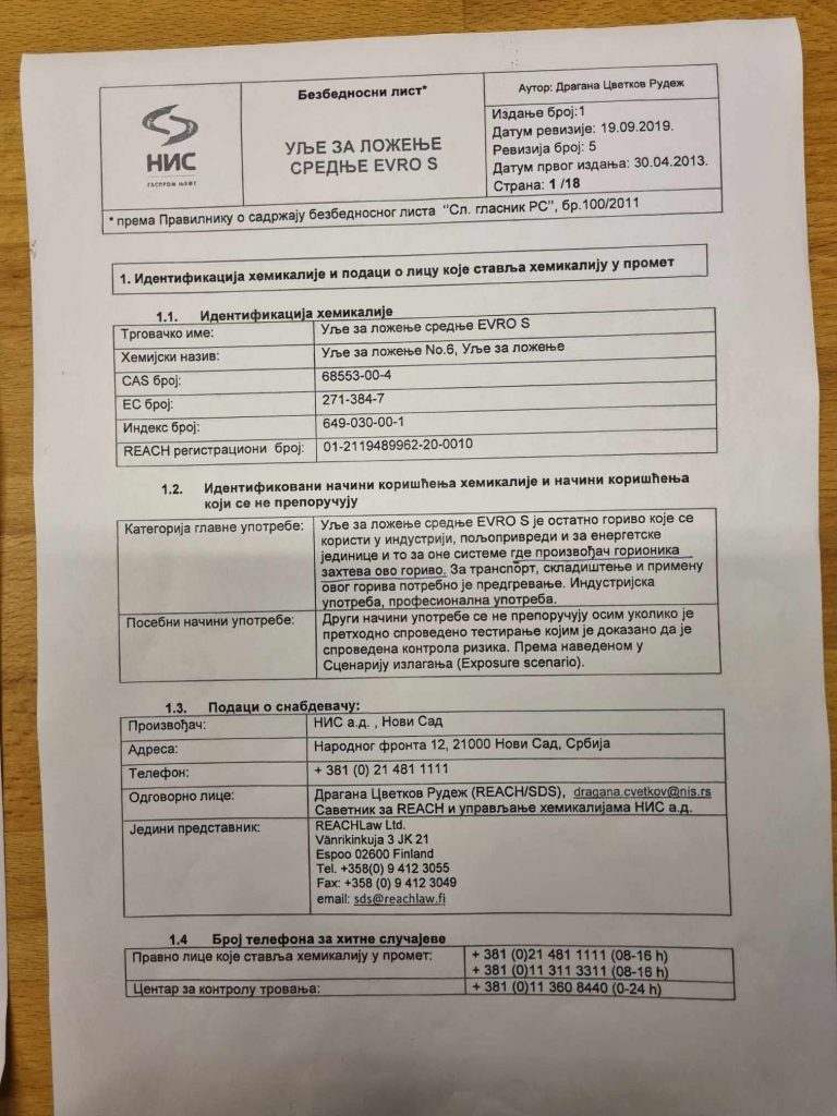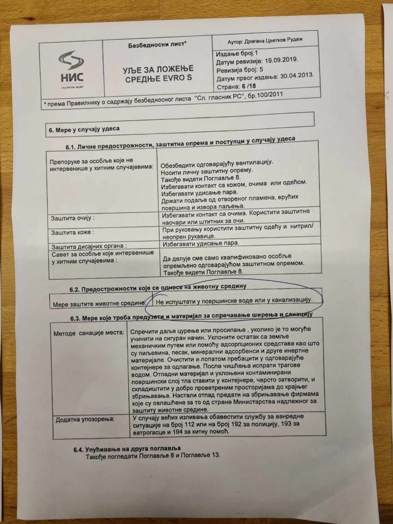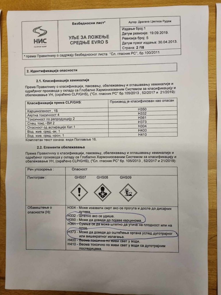 On je pokazao bezbednosni list iz NIS-a, koji se odnosi na bolje ulje od onog u Leskovcu, ali takođe S klase i za koje piše da je kancerogeno – „štetno ako se udiše i može da dovede do pojave karcinoma, ali i do oštećenja organa usled dugotrajnog ili višekrtanog izlaganja“, citirao je.