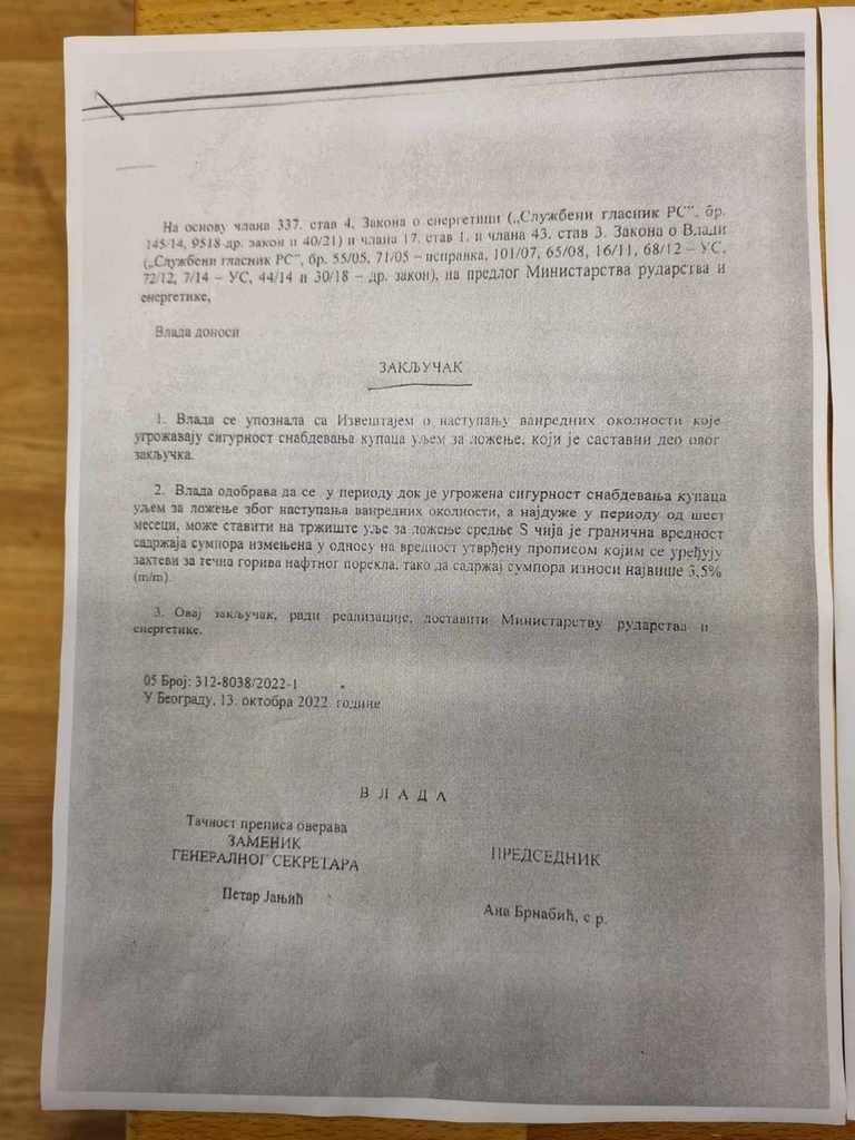 On je ponovo podsetio da je Uredbom Vlade Srbije odobreno, zbog energetske krize, da u periodu od oktobra 2022. do aprila ove godine može da se koristi ulje S klase sa količinom sumpora preko 3,5 posto.