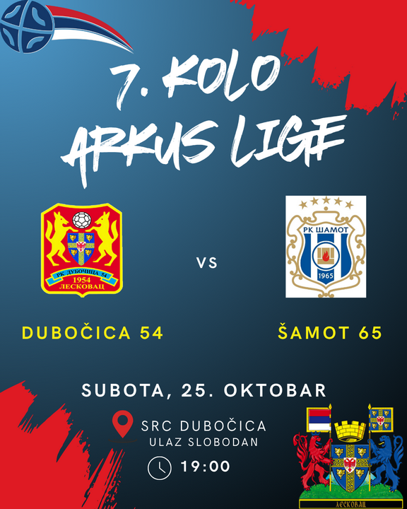 Rukometaši „Dubočice 54“ iz Leskovca na domaćem terenu dočekaće ekipu Šamota iz Aranđelovca, u meču 7. kola ARKUS lige u subotu, 25. oktobra, sa početkom u 19 sati, u hali Sportsko rekreativnog centra Dubočica.
