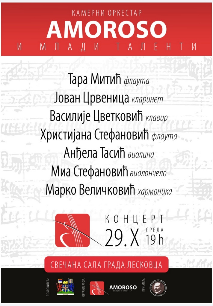 Koncert „Amoroso i mladi talenti“, u okviru projekta „U ritmu klasike 2025“, biće održan u sredu 29. oktobra u Svečanoj sali grada Leskovca u 19 sati. Na koncertu će nastupiti flautistkinje Tara Mitić i Hristijana Stefanović, klarinetista Jovan Crvenica, pijanista Vasilije Cvetković, violinistkinja Anđela Tasić, violončelistkinja Mia Stefanović i solista na harmonici Marko Veličković.