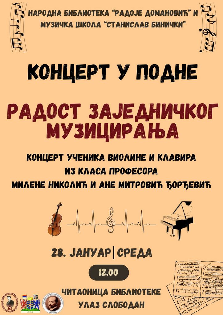 Narodna biblioteka „Radoje Domanović“ u Leskovcu u saradnji sa Muzičkom školom „Stanislav Binički“ u Leskovcu organizuje Koncert u podne – „Radost zajedničkog muziciranja“, u sredu 28. januara sa početkom u 12 sati.