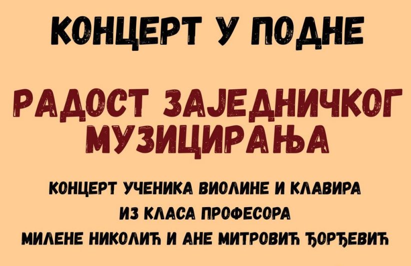 Ovom prilikom nastupiće učenici violine i klavira iz klasa profesora Milene Nikolić i Ane Mitrović Đorđević, a koje će se naći i u ulozi izvođača.