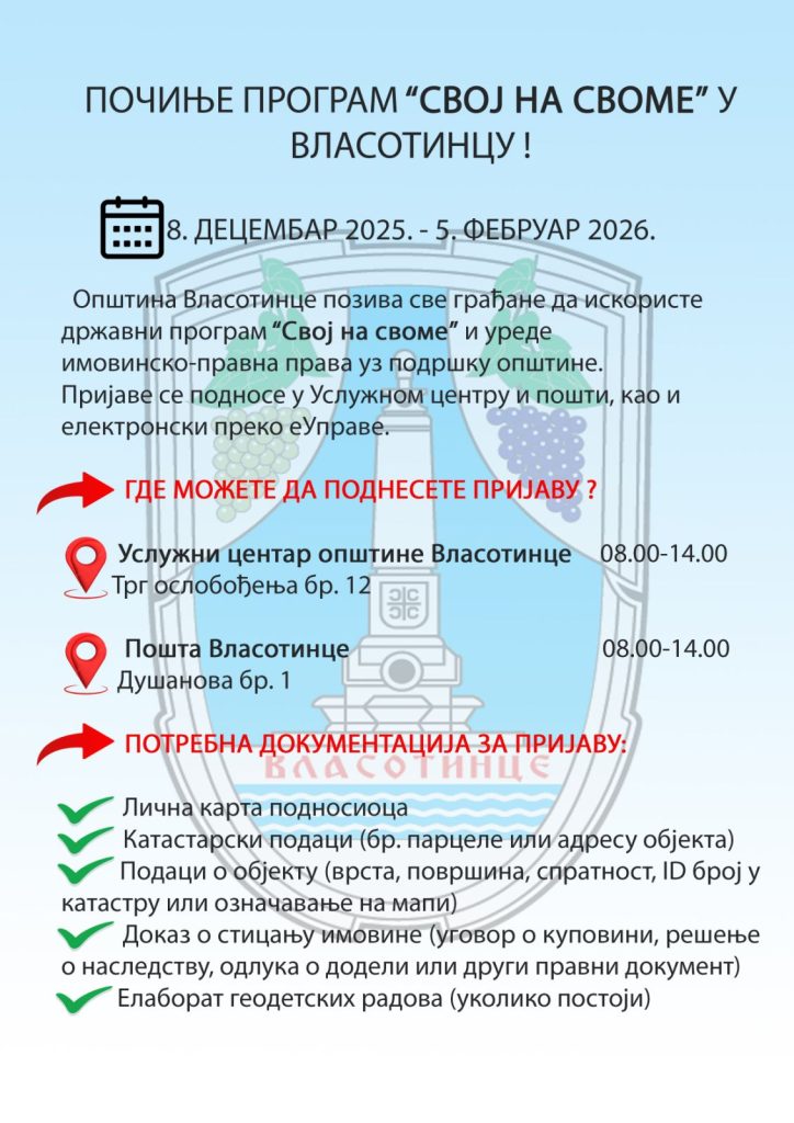 Opština Vlasotince poziva građane da iskoriste državni program „Svoj na svome“ i urede svoja imovinska prava. Oni to mogu da učine prijavom elektronskim putem, preko portala svojnasvome.gov.rs ili lično u Uslužnom centru opštine Vlasotince (Trg oslobođenja br. 12) i na šalteru Pošte u Vlasotincu (ul Dušanova br. 1 ) od 8 do 14 sati.