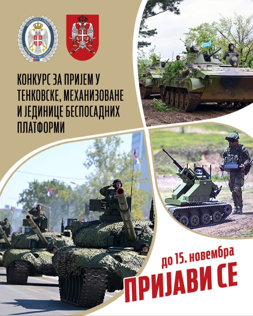 Vojska Srbije je raspisala konkurse za prijem novih profesionalnih vojnika u tenkovske i mehanizovane bataljone i vodove besposadnih platformi u komandnim bataljonima Treće brigade Kopnene vojske.