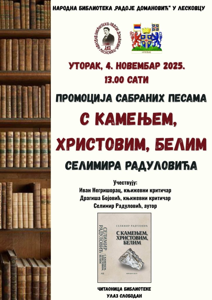 U utorak 4. novembra u 13 sati u čitaonici Narodne biblioteke „Radoje Domanović“ u Leskovcu biće organizovana promocija sabranih pesama „S kamenjem, Hristovim, belim“ Selimira Radulovića, upravnika Biblioteke Matice srpske.