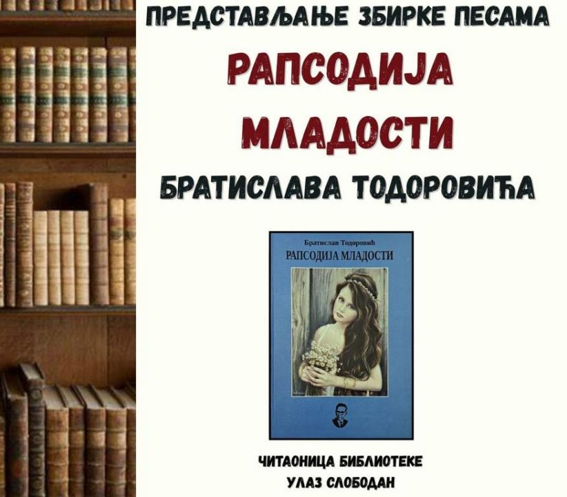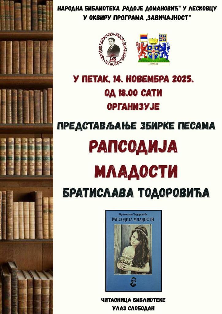 U okviru programa „Zavičajnost“, Narodna biblioteka „Radoje Domanović“ u Leskovcu organizuje promociju zbirke pesama „Rapsodija mladosti“ Bratislava Todorovića, u petak, 14. novembra sa početkom u 18 sati.