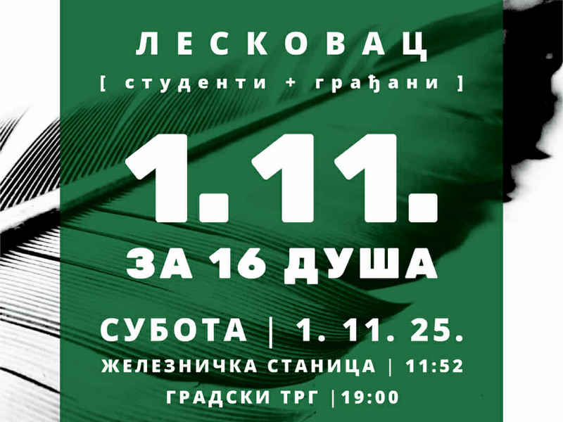 Nezavisna grupa građana i studenata poziva građane Leskovca na miran i dostojanstven komemorativni skup u znak sećanja na 16 žrtava pada nadstrešnice pre ravno godinu dana 1.11. 24. na Železničkoj stanici u Novom Sadu. U subotu 1. novembra biće održana dva protestna skupa. Jedan ispred Železničke stanice u 11.52 i drugi sa početkom u 19 sati na Gradskom trgu odakle će krenuti u protestnu šetnju i još jednom obići sve odgovorne institucije koje su dužne da im daju ove odgovore u skladu sa zakonima na koje ih obavezuje Ustav Republike Srbije, profesionalna etika i zakletva koju su dali pred svim građanima.