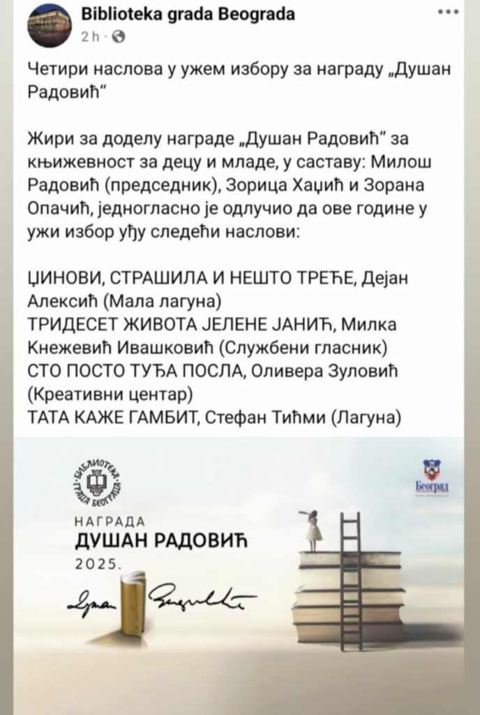 Uz njegov roman u izdanju Lagune, u najužem izboru su još i „Džinovi, strašila i nešto treće“ Dejana Aleksića (Mala laguna), „Trideset života Jelene Janić“ Milke Knežević Ivašković (Službeni glasnik) i „Sto posto tuđa posla“ Olivere Zulović (Kreativni centar).