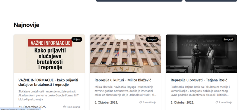 Sajt stopbrutalnosti.com, koji prati slučajeve nasilja u Srbiji, od danas je i zvanično pušten u rad. Ovaj zajednički projekat IT blokade i Akademskog plenuma ima za cilj prikupljanje slučajeve fizičkog i pravnog nasilja nad građanima Srbije u jedinstvenu bazu podataka „Za dan posle“, koja će biti korišćena kada pravosudni organi budu u punom kapacitetu obavljali svoj posao.