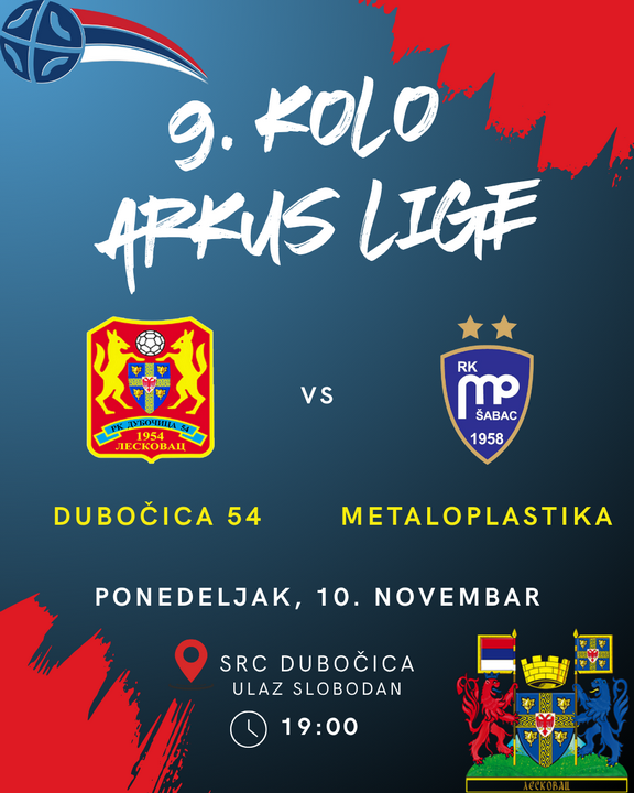 Rukometni spektakl očekuje ljubitelje sporta u Leskovcu u ponedeljak, 10. novembra, kada će se odigrati derbi utakmica 9. kola ARKUS lige. Rukometni klub Dubočica 54 ugostiće u SRC Dubočica dvostrukog prvaka Evrope, ekipu Metaloplastike iz Šapca. Početak meča zakazan je za 19 sati.