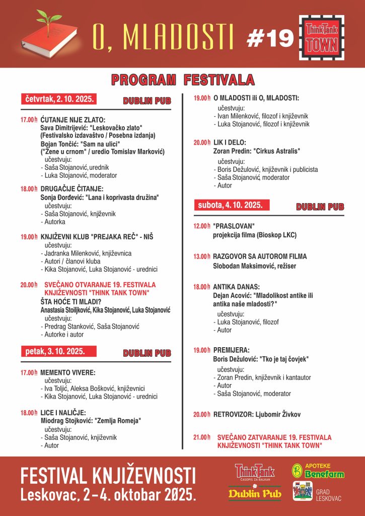 XIX Festival književnosti „Think Tank Town“ biće održan od 2. do 4. oktobra. Svi programi biće održani u Narodnom muzeju Leskovac osim projekcije filma „Praslovan“ (Bioskop LKC-a), a ulaz za sve programe je besplatan.