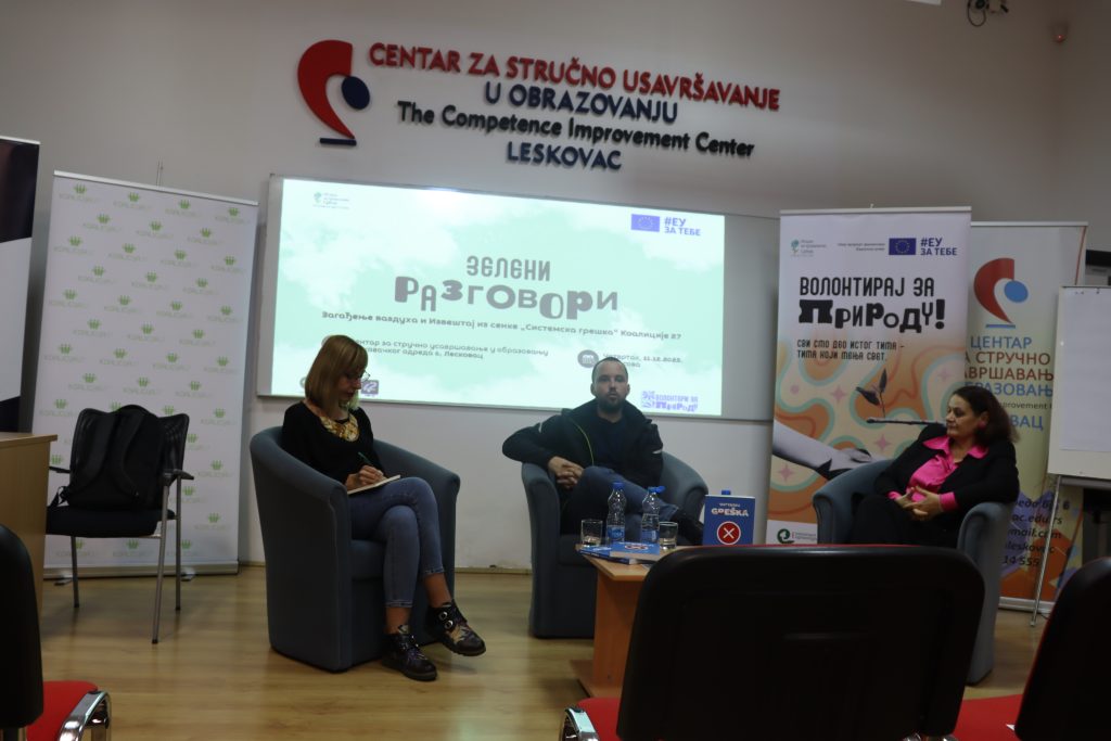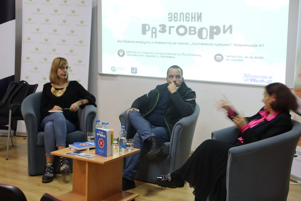 a Zelenim razgovorima, koje su u četvrtak u Centru za stručno usavršavanje organizovali Tim 42 i Koalicija 27, stručnjaci i građani razgovarali su o uzrocima i posledicama zagađenja vazduha u Leskovcu – gradu koji je već 12. februara dostigao zakonski godišnji limit prekoračenja zagađenja.